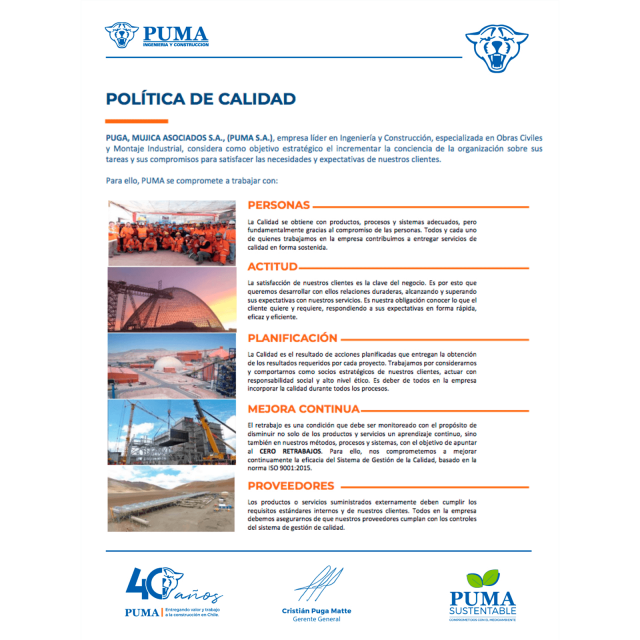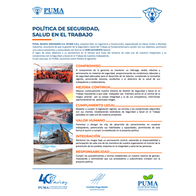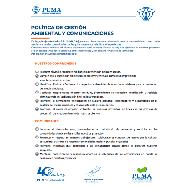 Desde su fundación en 1982, PUMA ha tenido un compromiso irrestricto con el desarrollo empresarial sostenible e innovador, apoyando a las comunidades presentes en los proyectos que hemos participado, y garantizando el progreso del país y sus futuras generaciones.
